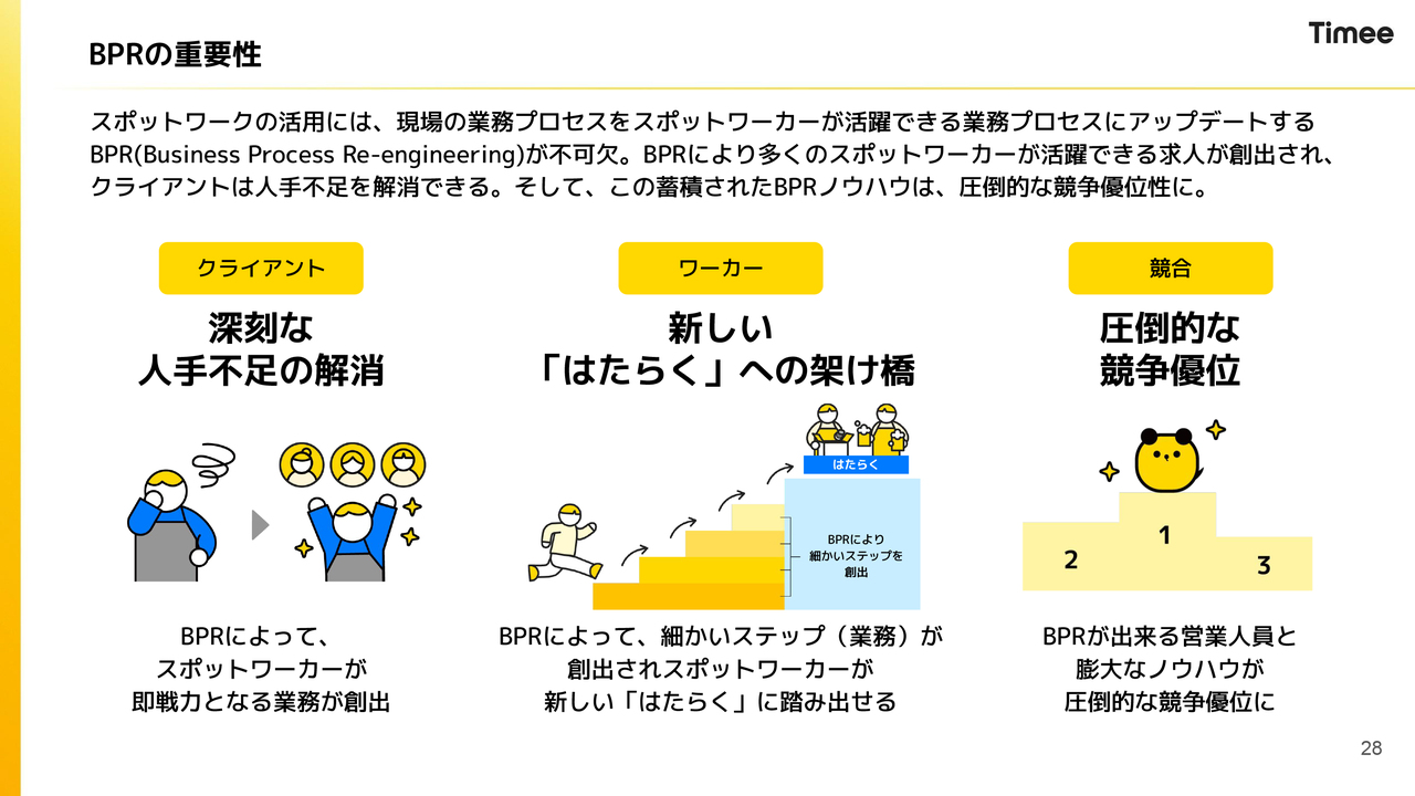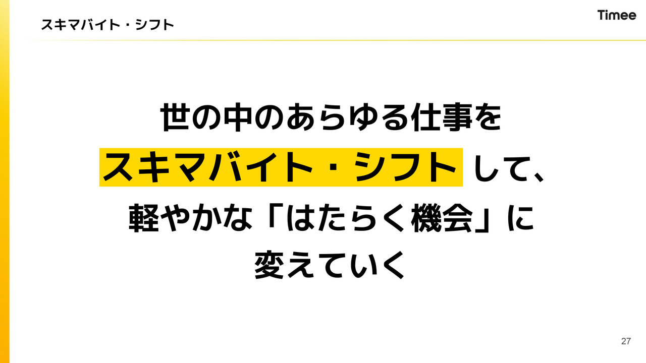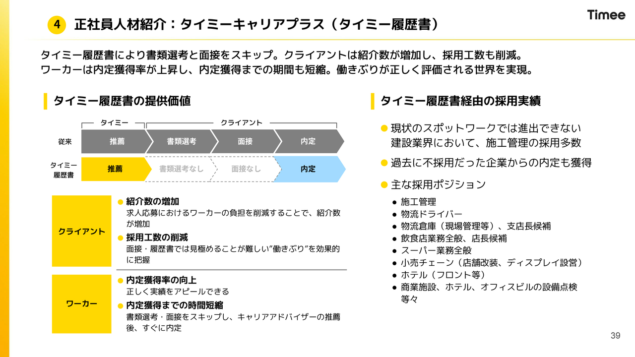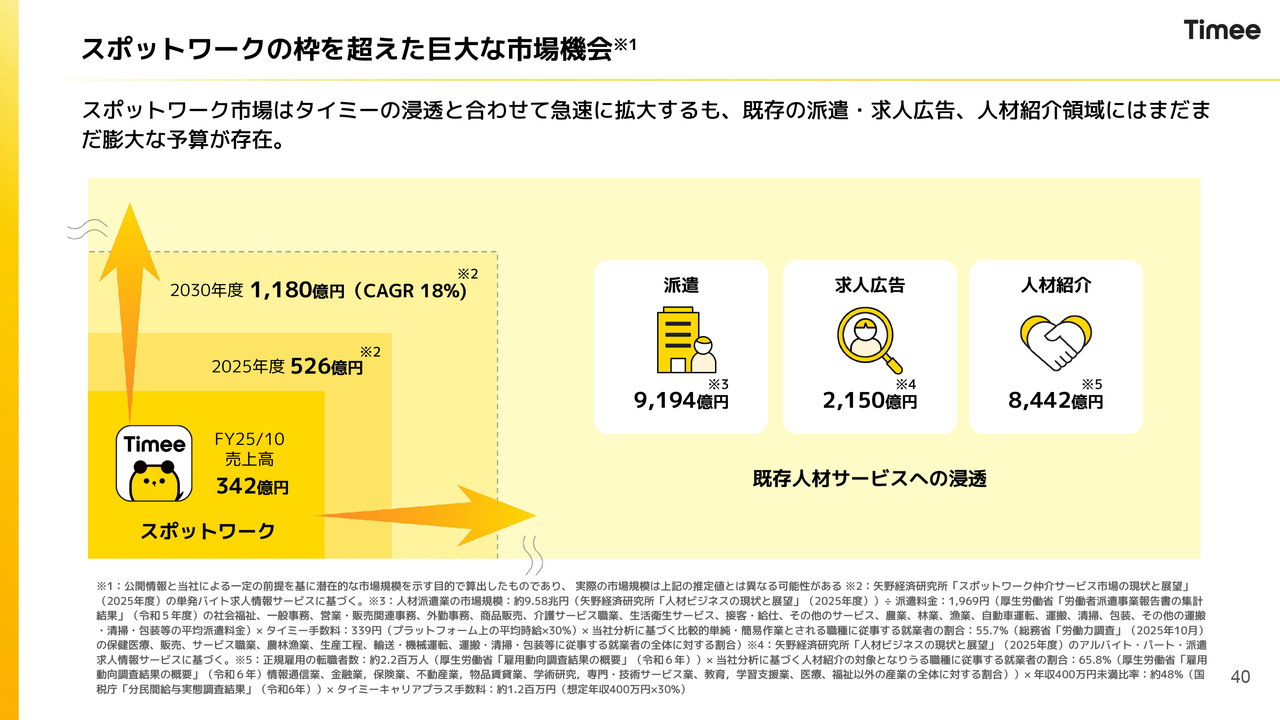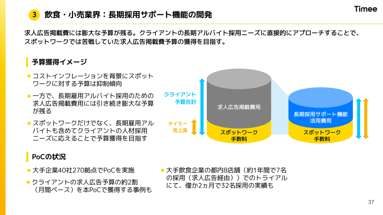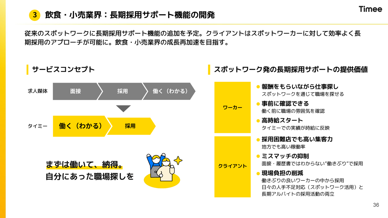 そのため、採用決定単価、つまり「通常の求人媒体よりも、タイミーから来たほうが安いです」といった、1人当たりの採用単価で勝負していくことを考えています。