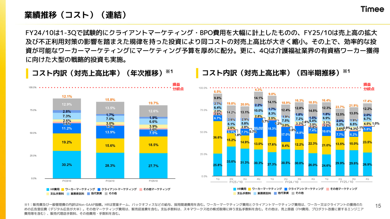また、マーケティング費用に関しては、ワーカーマーケティングとクライアントマーケティングの内訳がありますが、全体的に削減されており、利益率が大幅に改善している構造となっています。