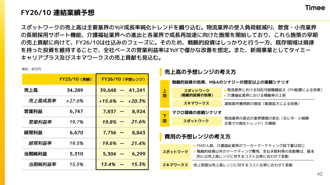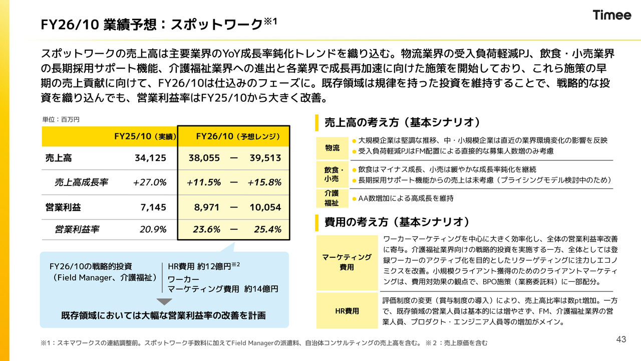 レンジの考え方については、上限と下限を記載しています。主にスポットワークにおいては、上限として物流業界での施策、特にField Managerの取り組みが功を奏し、募集数の増加に伴い売上が伸びていくことを想定しています。
