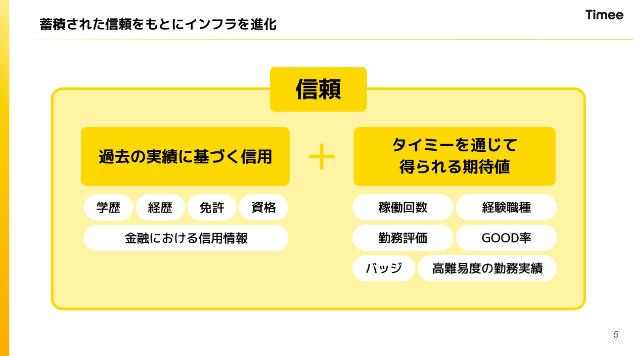 私たちは、信頼データを保有しています。この「信頼」とは、学歴や経歴といった過去の実績に基づく信用にタイミーを通じて得られる期待値をあわせたものです。