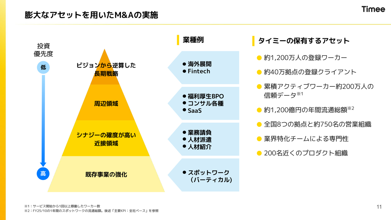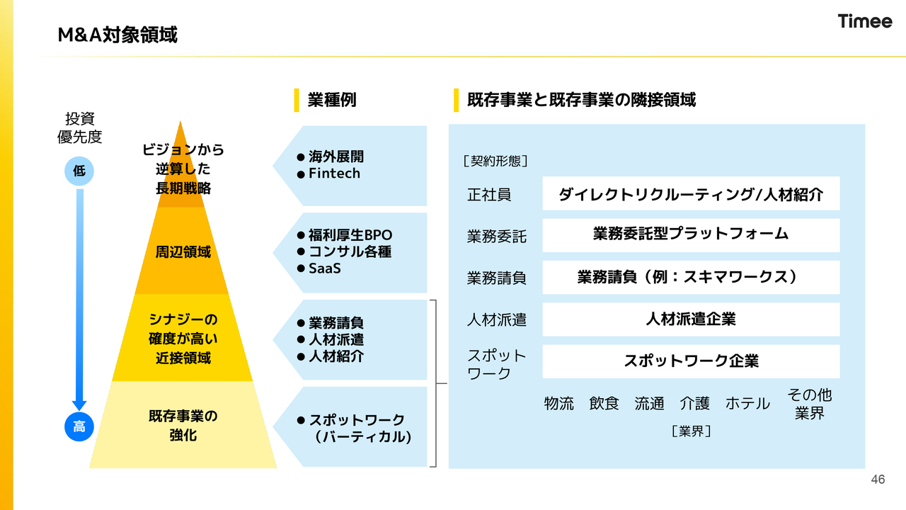スライドとしては冒頭と一部重複しますが、スライド右側に記載した「契約形態」のとおり、正社員、業務委託、業務請負、人材派遣、そして現在行っているスポットワークに関して、業界ごとに全方位でM&Aおよびアライアンスを検討しています。