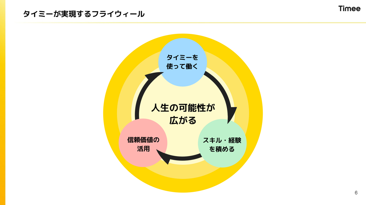 まさに「フライウィール」の概念において、タイミーを使って働き、スキルや経験を積み重ね、最終的にその信頼価値を活用するという、この3つの要素に私たちはしっかりとコミットしていきたいと考えています。
