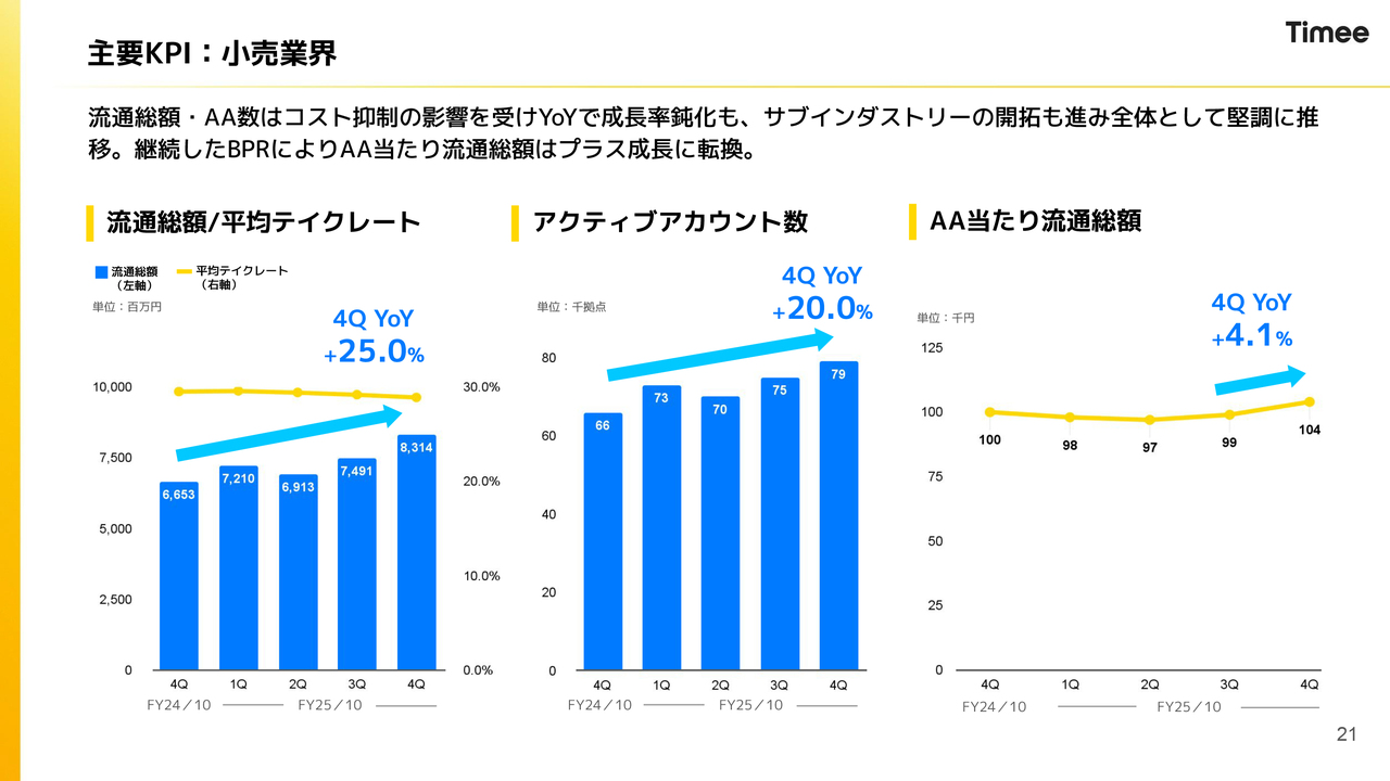 小売業界では高い成長を維持しており、アクティブアカウント数は前年同期比20.0パーセント成長、アカウント当たりの流通総額は4.1パーセント増加しています。