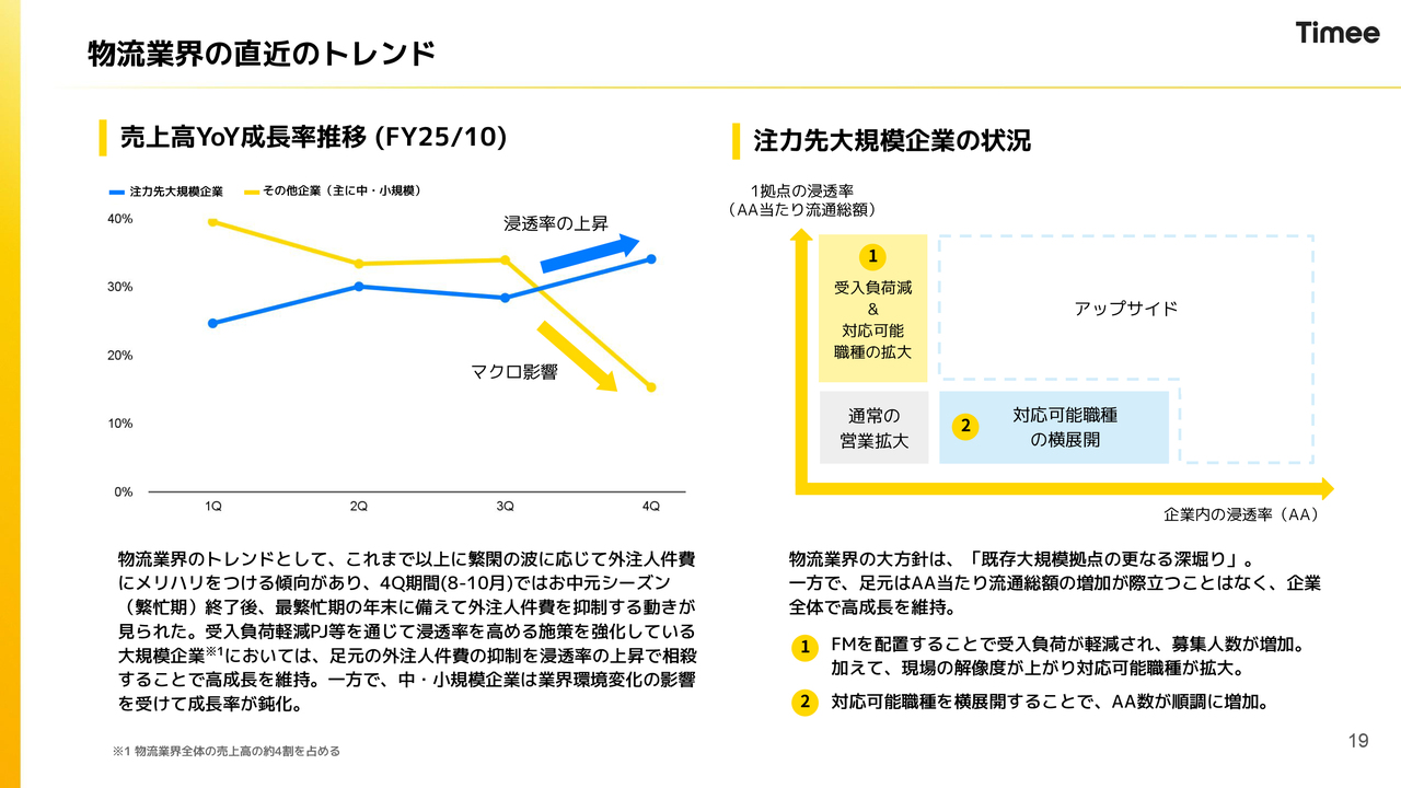 スライドには物流業界の直近のトレンドを記載していますが、全体の業界トレンドとして、繁閑の波に応じて外注人件費の使い方にメリハリがついてきている状況です。