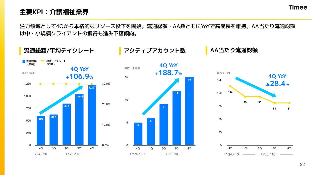介護福祉業界は高い成長を維持しており、主にアクティブアカウントの増加が成長の原動力となっています。