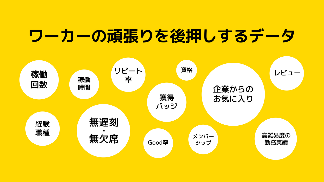 無遅刻・無欠席をはじめ、企業側がどのようなワーカーを重視しているのか、また、ワーカーがどのような企業を意識しているのか、さらに定性のレビューなどさまざまな情報を得られる状況にあり、まさにワーカーのがんばりを後押しするデータを豊富に揃えていると言えます。