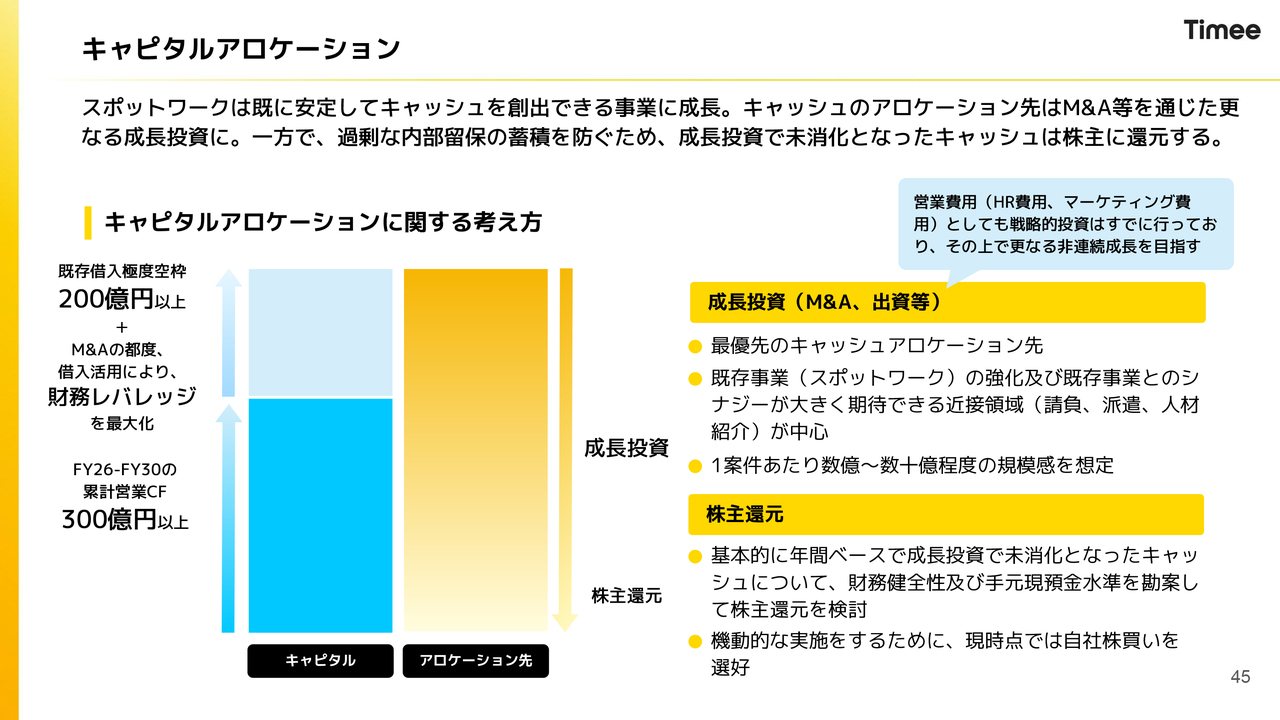 成長投資を第一優先とし、未消化となった場合には、現預金として留めておくのではなく、資本効率や株主還元の観点からキャピタルアロケーションとして適切な選択肢を実行していく方針です。