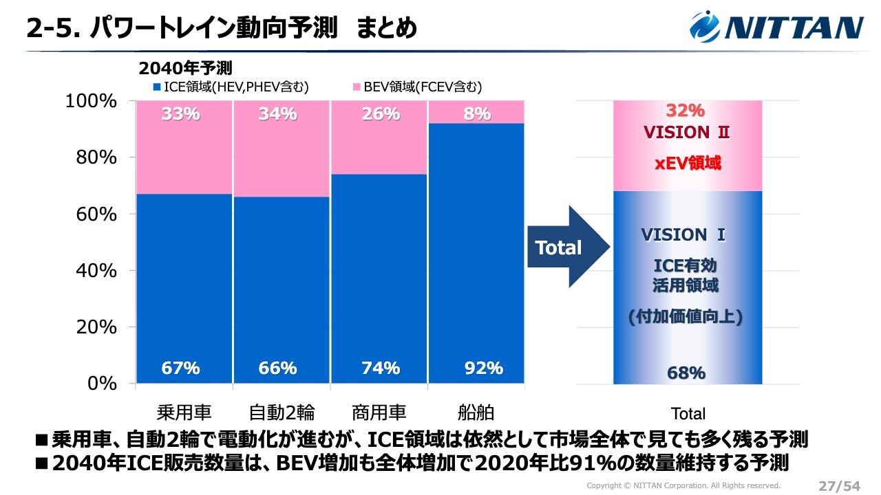 市場動向を包括的にまとめると、スライドの図のようになります。一番右側に示された棒グラフによると、2040年にはモビリティ全体に占めるICEの比率が68パーセントとなる見通しです。また、2020年と比較してもICEは91パーセントの数量を維持すると予測されています。
