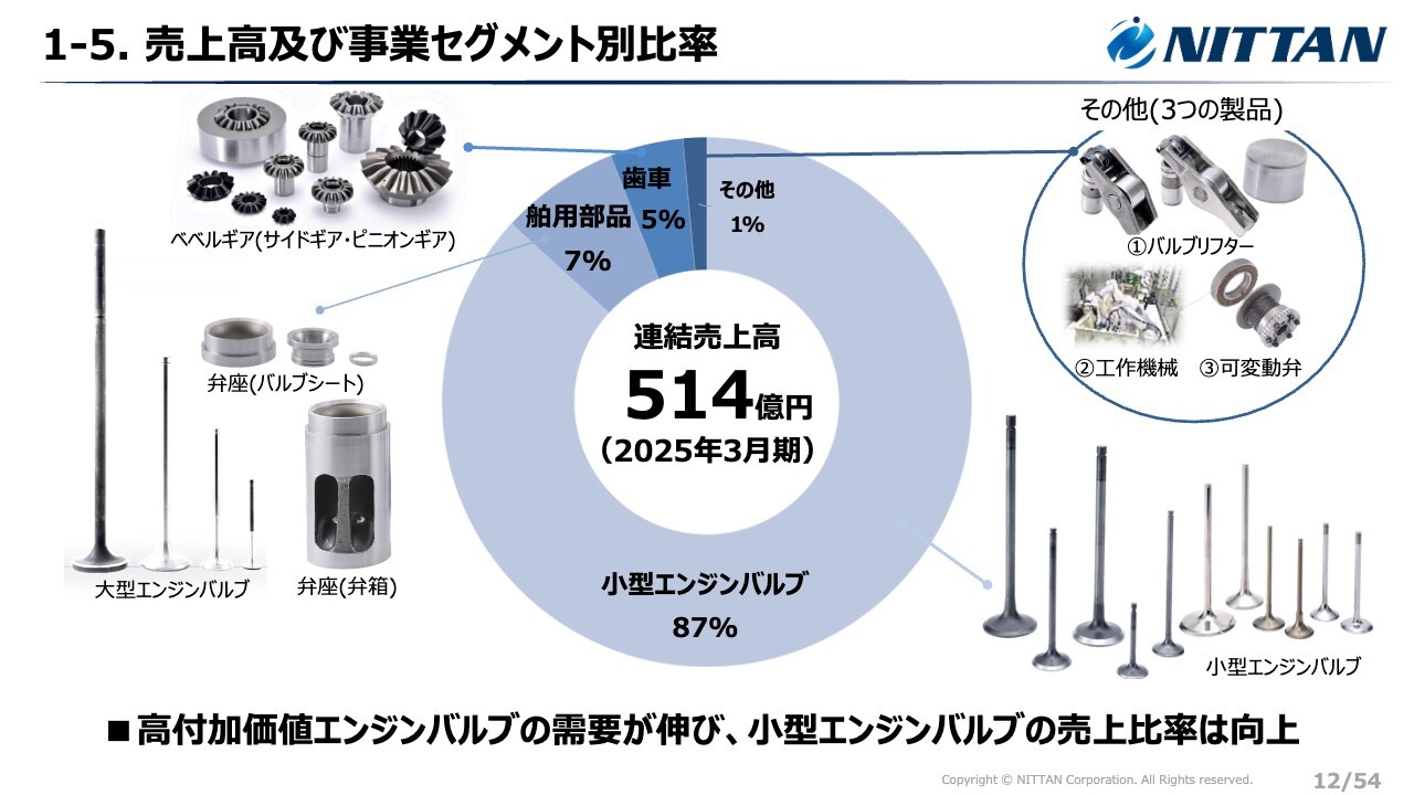 その中で小型エンジンバルブ事業の割合は、前年比プラス3パーセントの87パーセントと高い水準を維持しています。この背景には、エンジンバルブの中でも高付加価値製品である軸中空バルブ、傘中空バルブ、盛金バルブなどの売上が伸びていることが挙げられます。