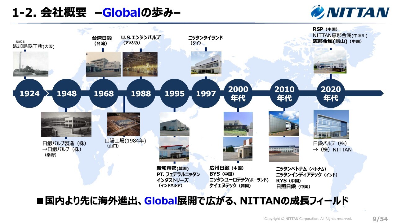 当社のグローバル展開の歩みについてご説明します。前身である恩加島鉄工所は、1924年に大阪で設立されました。その後、1948年に日鍛バルブ製造として当社の歴史が始まっています。