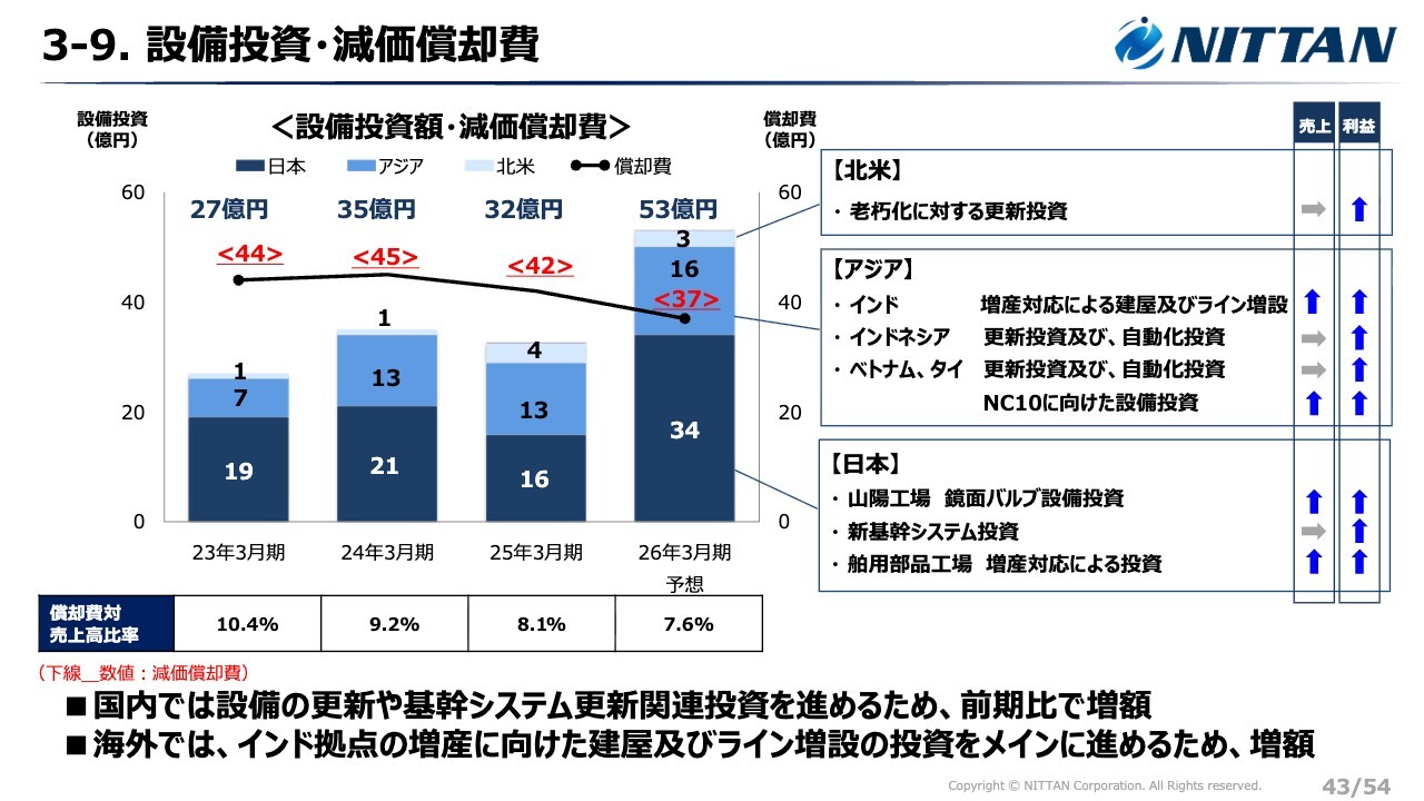 今期の投資額は、約53億円を予定しています。国内では山陽工場の鏡面バルブに関する設備投資と基幹システムの更新投資が主な内容です。なお、山陽工場の鏡面バルブに関する設備投資は北米向け輸出品に対するものであり、この輸出品に予想される関税等については価格へ反映することでお客さまと合意済みです。