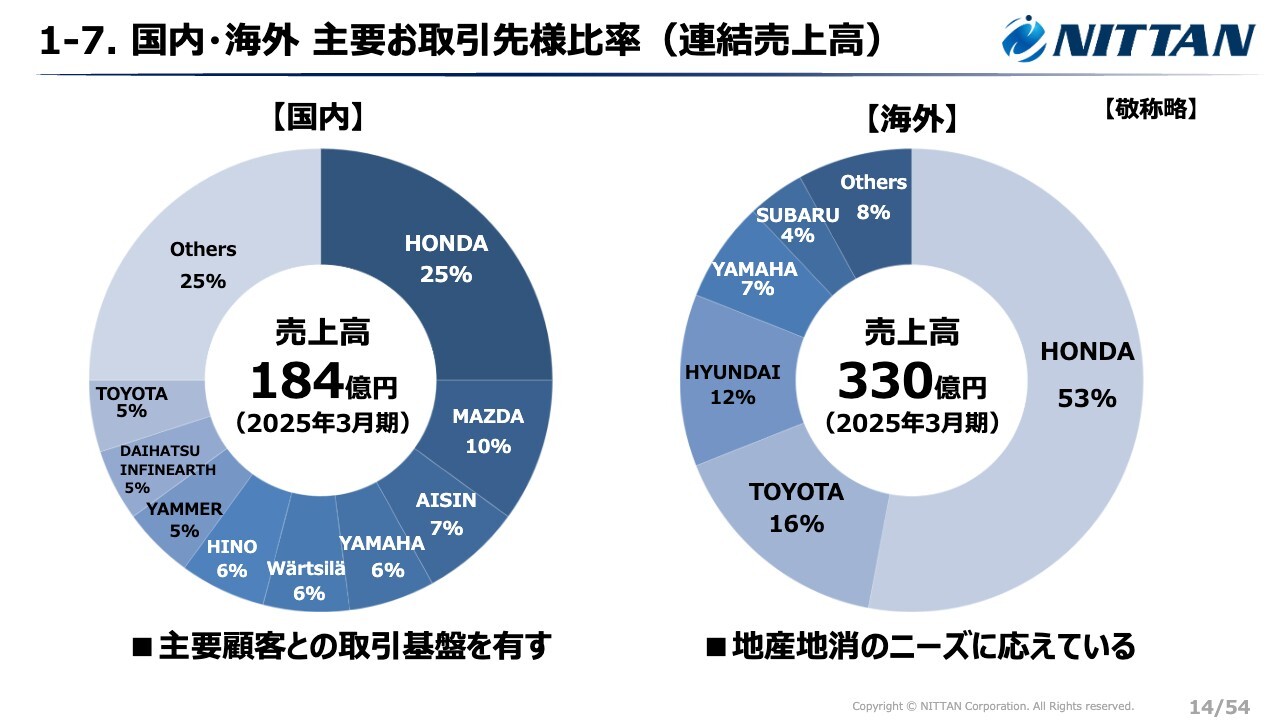 国内では、系列に属さない強みが発揮され、主要顧客との取引基盤が確立していることを示しています。海外では、特定顧客の比率が高い面もありますが、すべてのお客さまの地産地消のニーズに応えています。