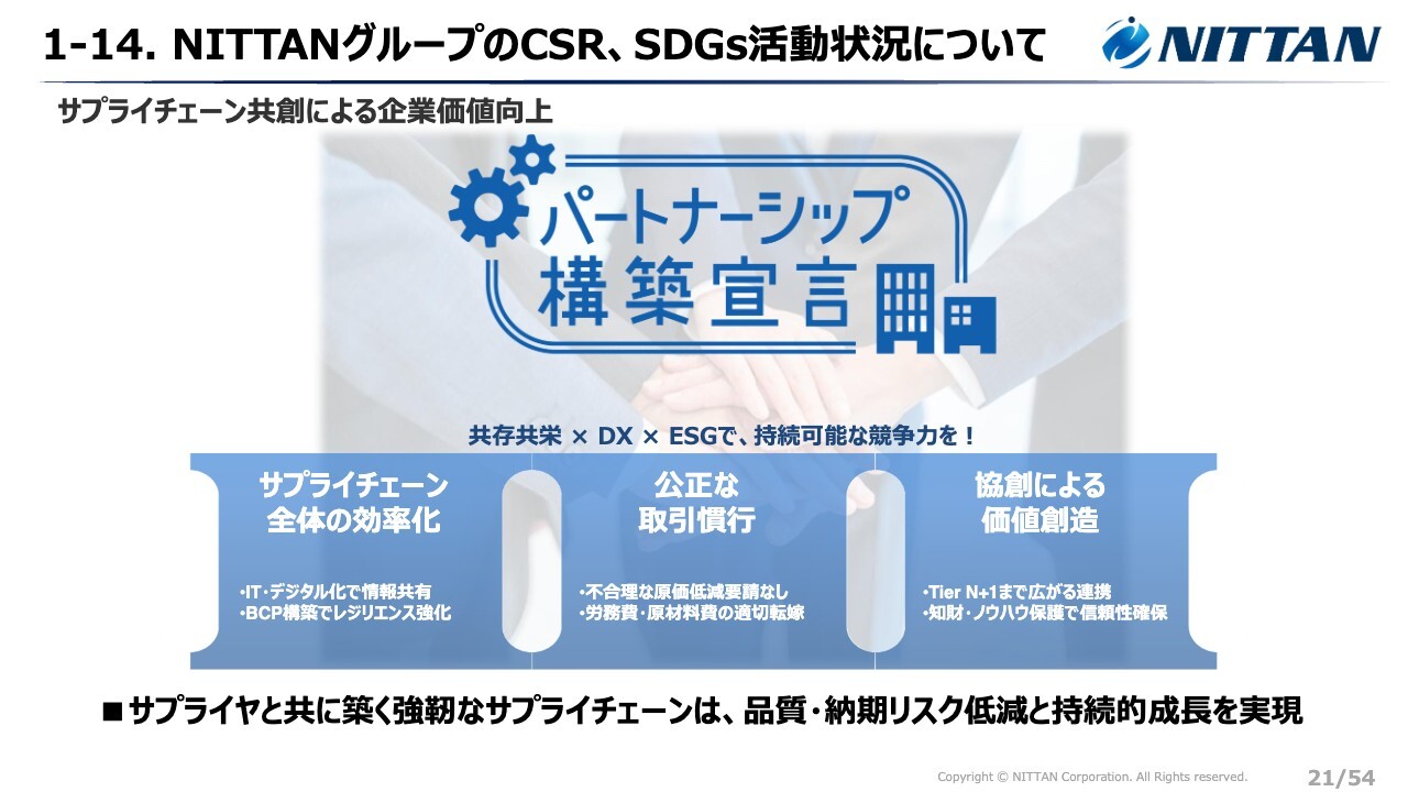 7月に宣言した「パートナーシップ構築宣言」の概要とその狙いについてご説明します。当社は、サプライチェーン全体で共存共栄を進めることで、品質や納期のリスクを低減し、持続可能な競争力を高めることを目指しています。