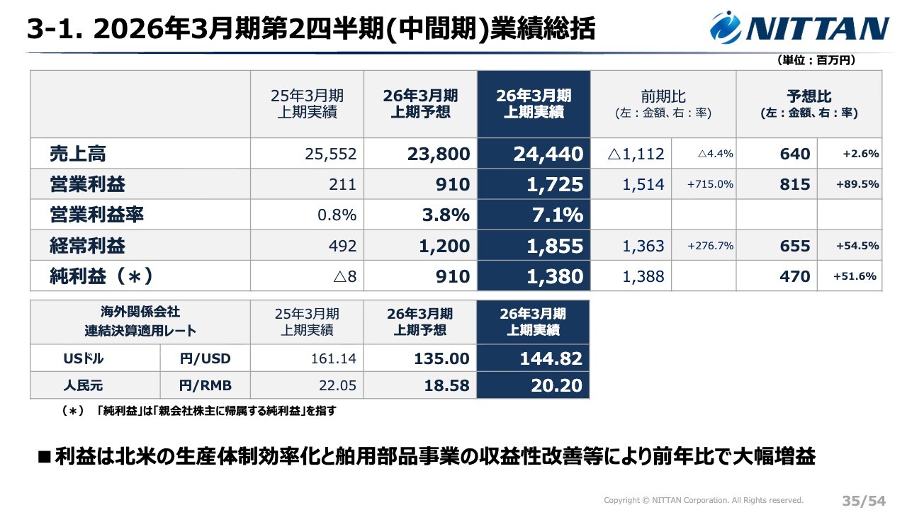 NITTAN、営業利益は前年比+715%と大幅成長 北米生産効率化、舶用部品収益性改善等が寄与