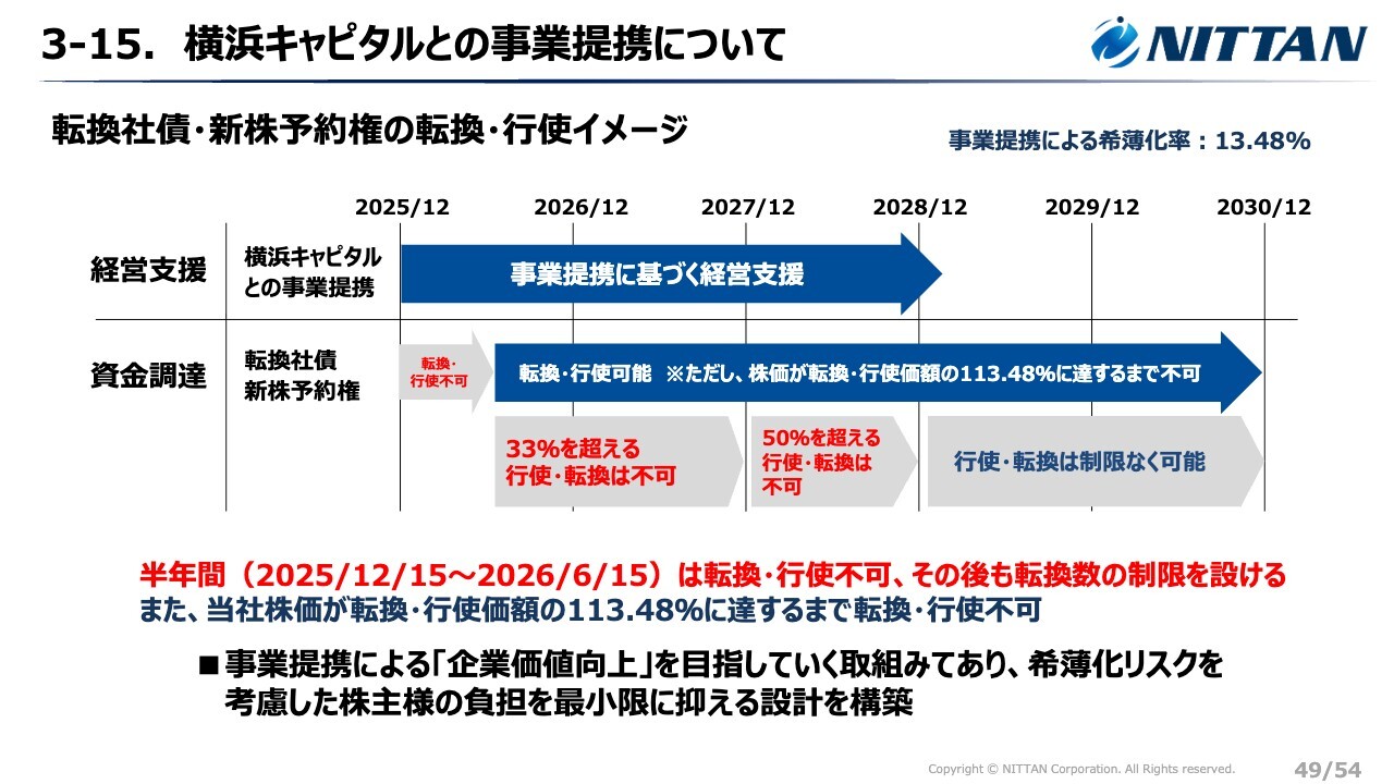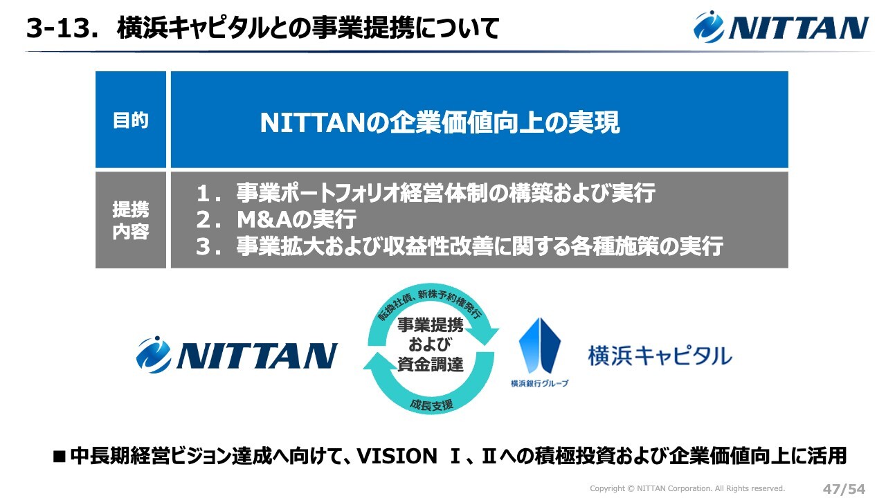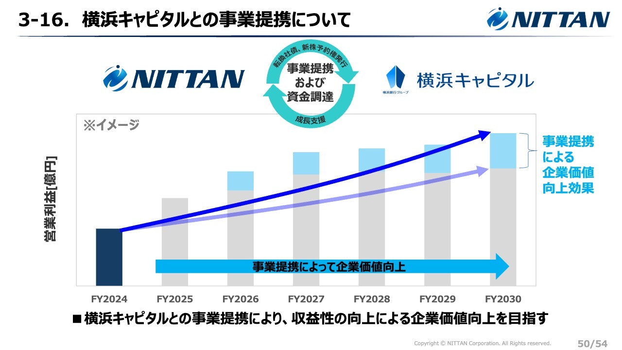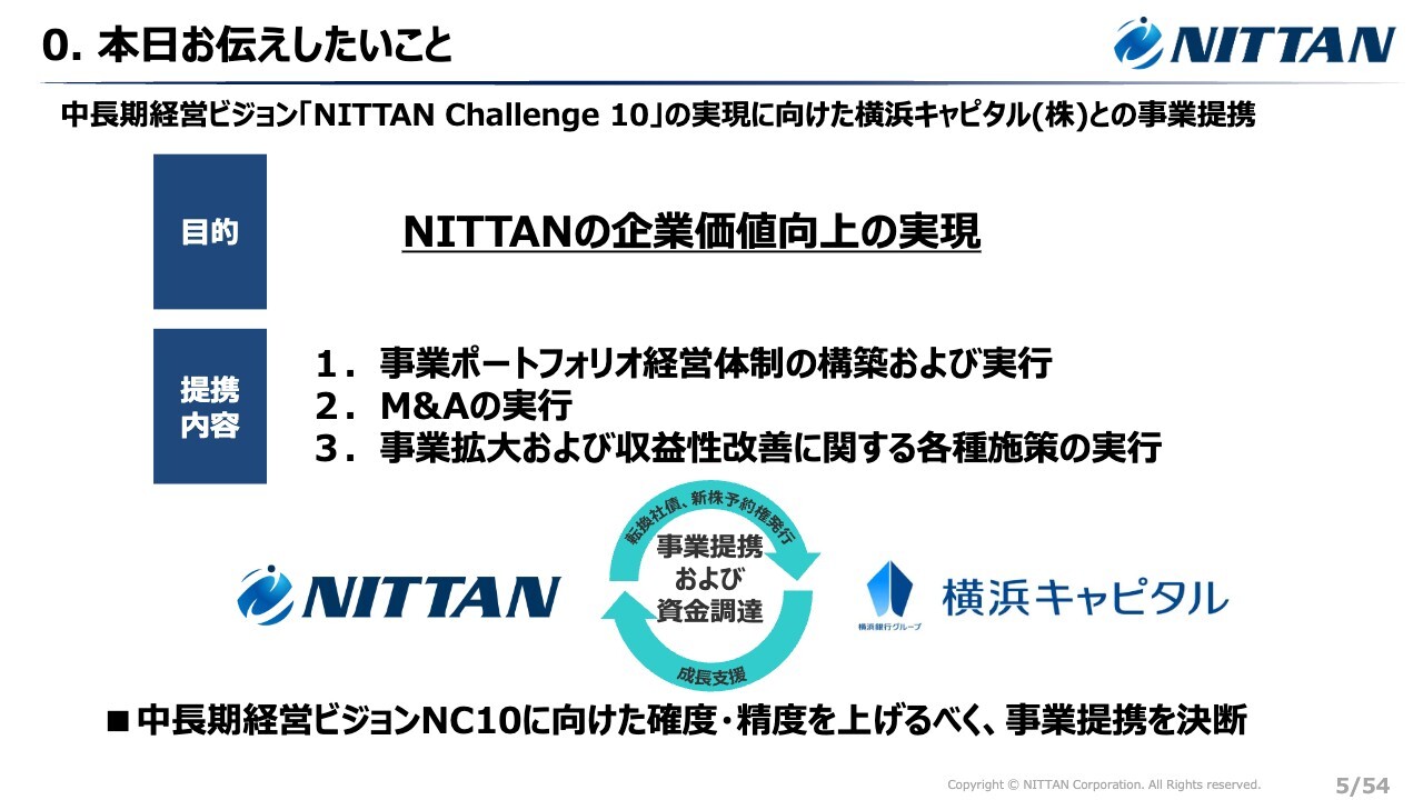 ここからは、11月28日に開示した横浜キャピタルとの事業提携についてご説明します。今回の事業提携の最大の目的は、NITTANの企業価値向上の実現です。そのための「NC10」の達成に向けたパートナーシップでもあります。