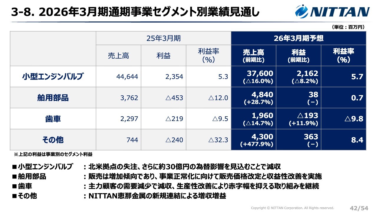 事業セグメント別の業績見通しについてご説明します。小型エンジンバルブ事業では、ホンダの北米工場における生産縮小の影響が見え始めています。
