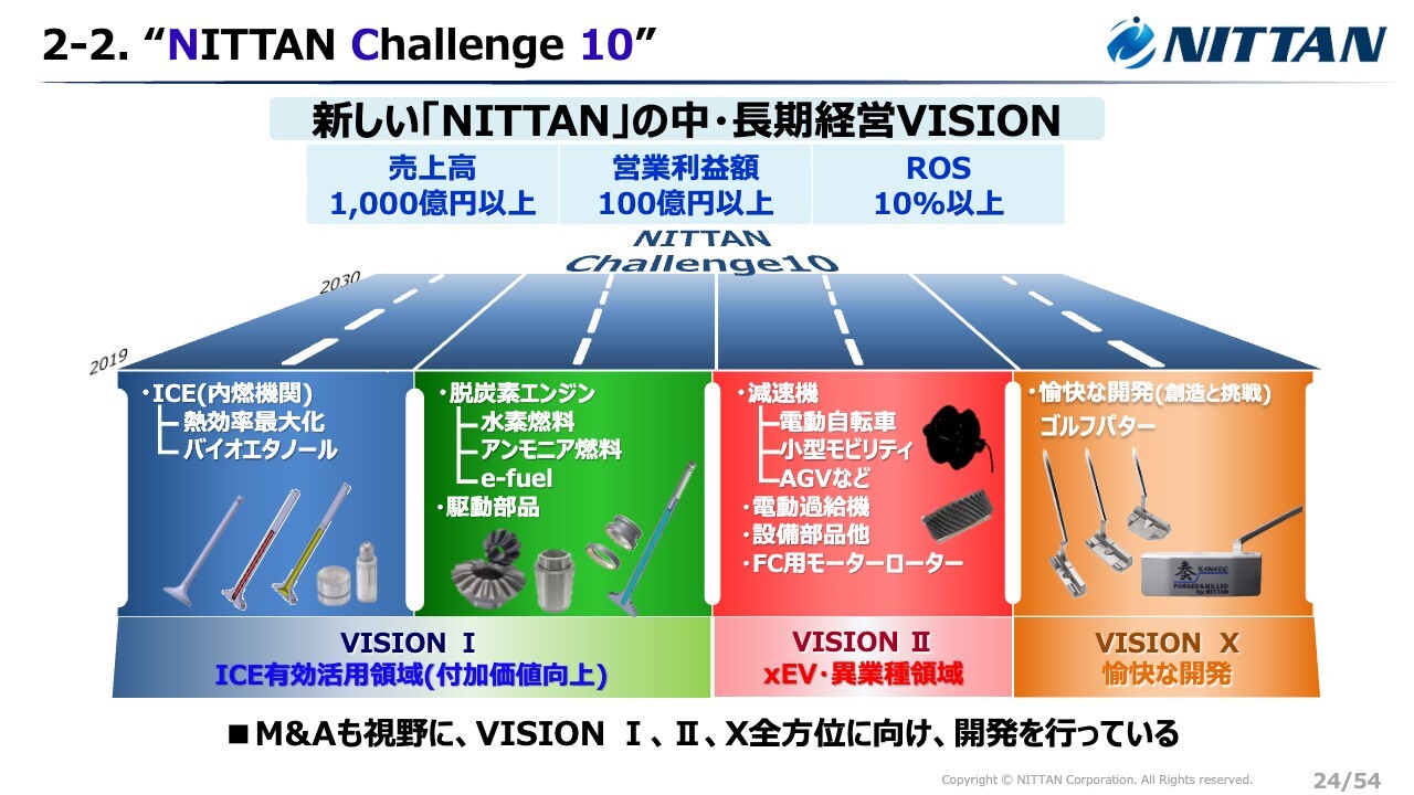 VISION Iは、既存の内燃機関部品の付加価値をより高め、事業の拡大を目指すものです。VISION IIは、電動化領域および異業種への積極的なアプローチにより、新たな事業を開拓することです。