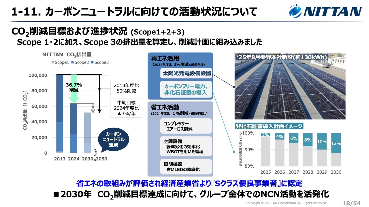 当社のカーボンニュートラル達成に向けた取り組みについてお伝えします。「NITTANカーボンニュートラル(NCN)」というグローバル方針を制定し、海外子会社を含めて愚直に展開しています。