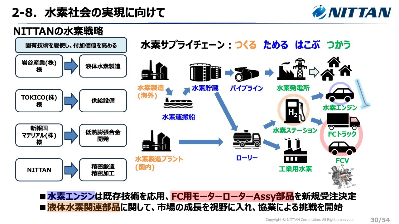 スライドの図のように、協力メーカーとともに、水素のサプライチェーン「つくる」「ためる」「はこぶ」「つかう」を、それぞれの得意分野を活かして構築していく取り組みを行っています。