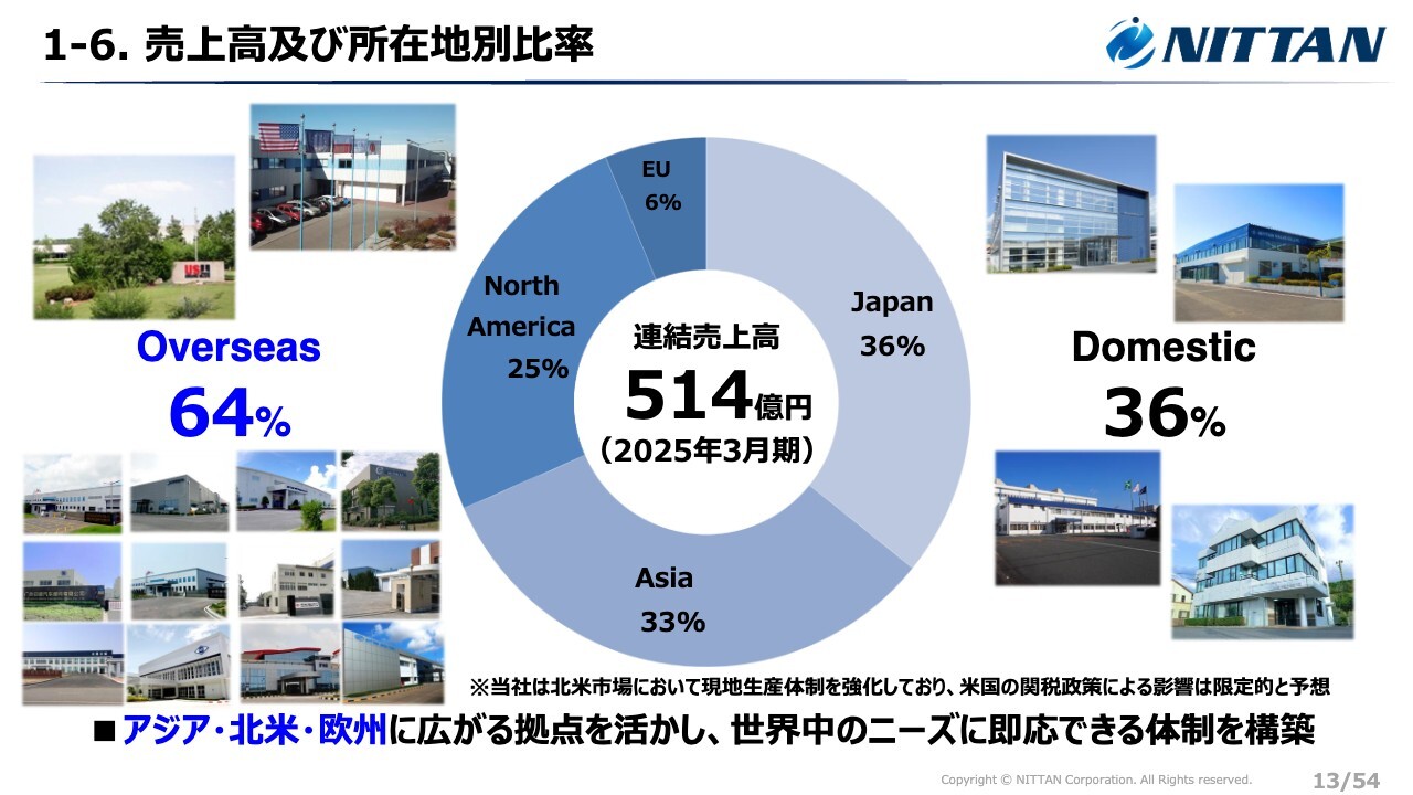 地域別の売上高では、海外売上高が全体の64パーセントを占めています。アジア、北米、欧州のグローバル拠点の強みを活かし、地産地消の体制を整えています。特に北米市場では現地生産体制を強化しており、アメリカの通商政策の影響も限定的と見ています。