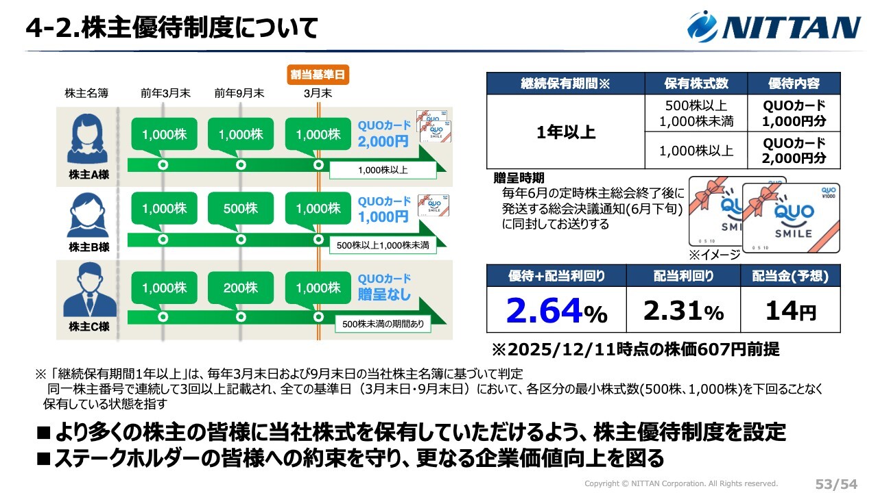 昨年から導入している株主優待制度についてです。保有株式数に応じて「QUOカード」を支給する内容となっています。