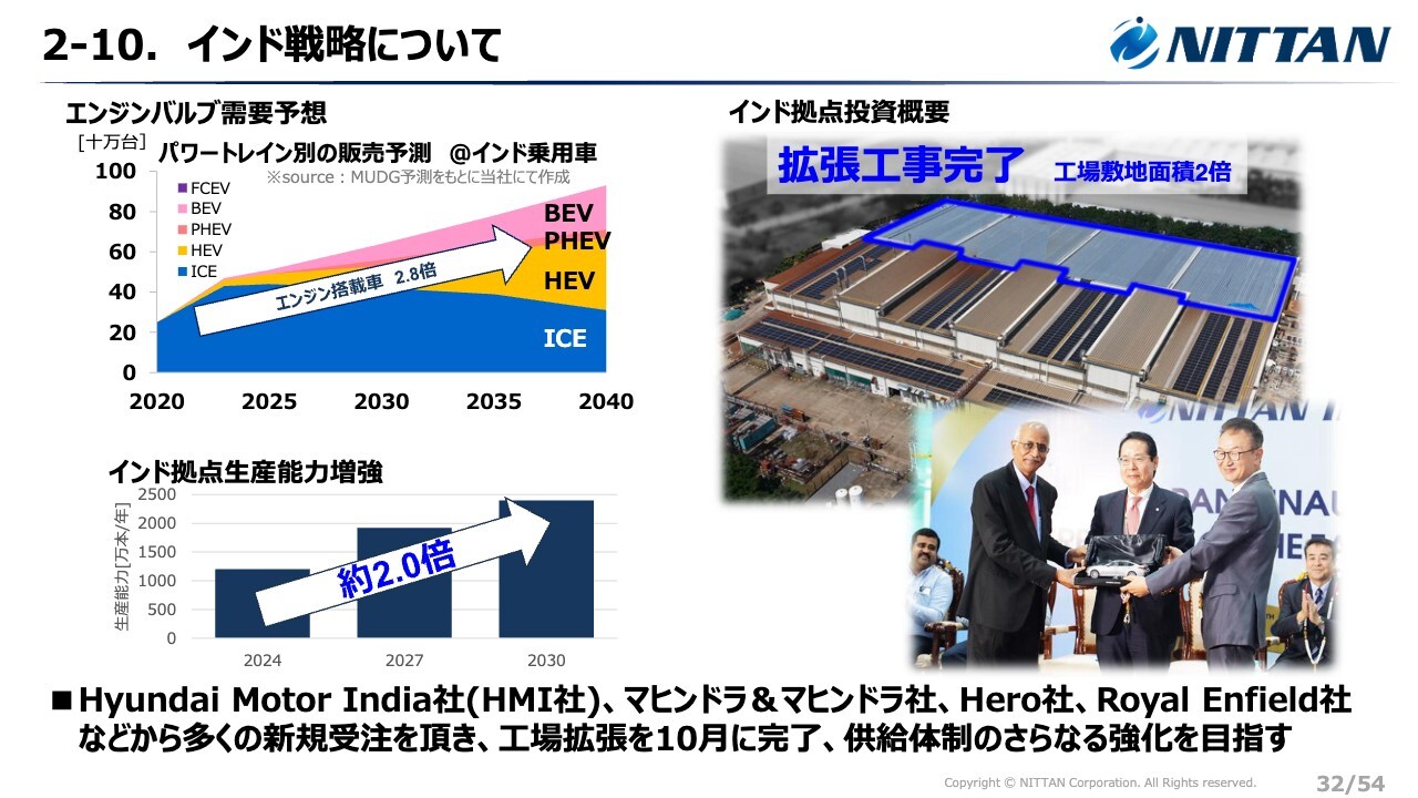 Hyundai Motor Indiaをはじめ、ローカルのお客さまであるマヒンドラ&マヒンドラ、Hero、Royal Enfieldから多くの新規受注をいただいており、その中には高付加価値バルブである軸中空バルブや傘中空バルブも含まれています。