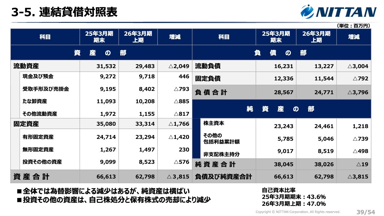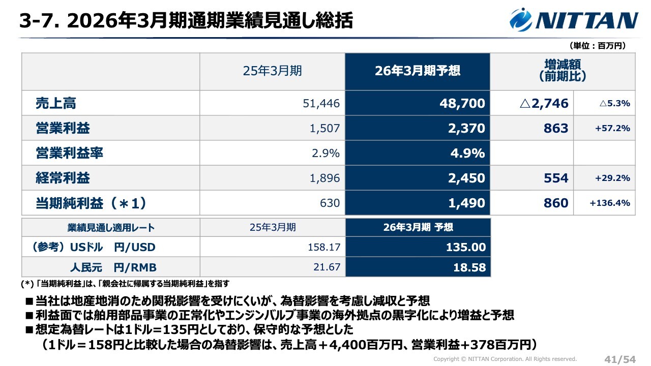 また、通期見通しの試算に用いた為替レートを非常に保守的に設定していることから、現時点では期初に発表した通期業績予想から変更はありません。ただし、2025年度の通期為替レートについては、多くの海外拠点が12月末のレートをもって確定するため、これを踏まえ、業績予想の修正が必要と判断した場合は、速やかに市場へ開示を行う方針です。