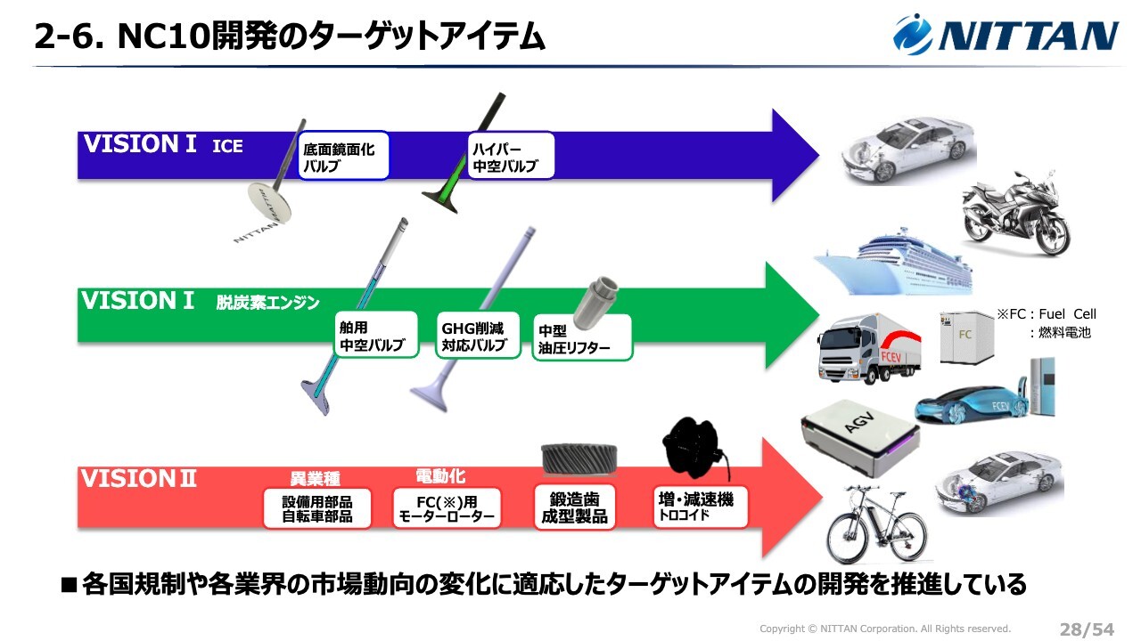 まず、VISION Ⅰには底面鏡面化バルブやハイパー中空バルブが含まれており、これらはICEの燃費改善に寄与するアイテムです。さらに、舶用中空バルブやGHG削減対応バルブなど、ICEが最も長く残るとされる舶用業界向けのアイテムの開発を積極的に進めています。