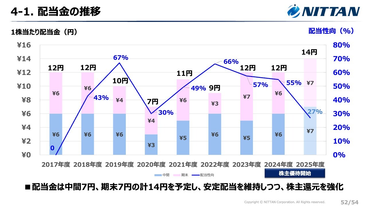 第4部の「株主還元」についてご説明します。配当金は中間7円、期末7円の計14円を予定し、安定配当を維持しつつ、株主還元の強化も検討していきます。