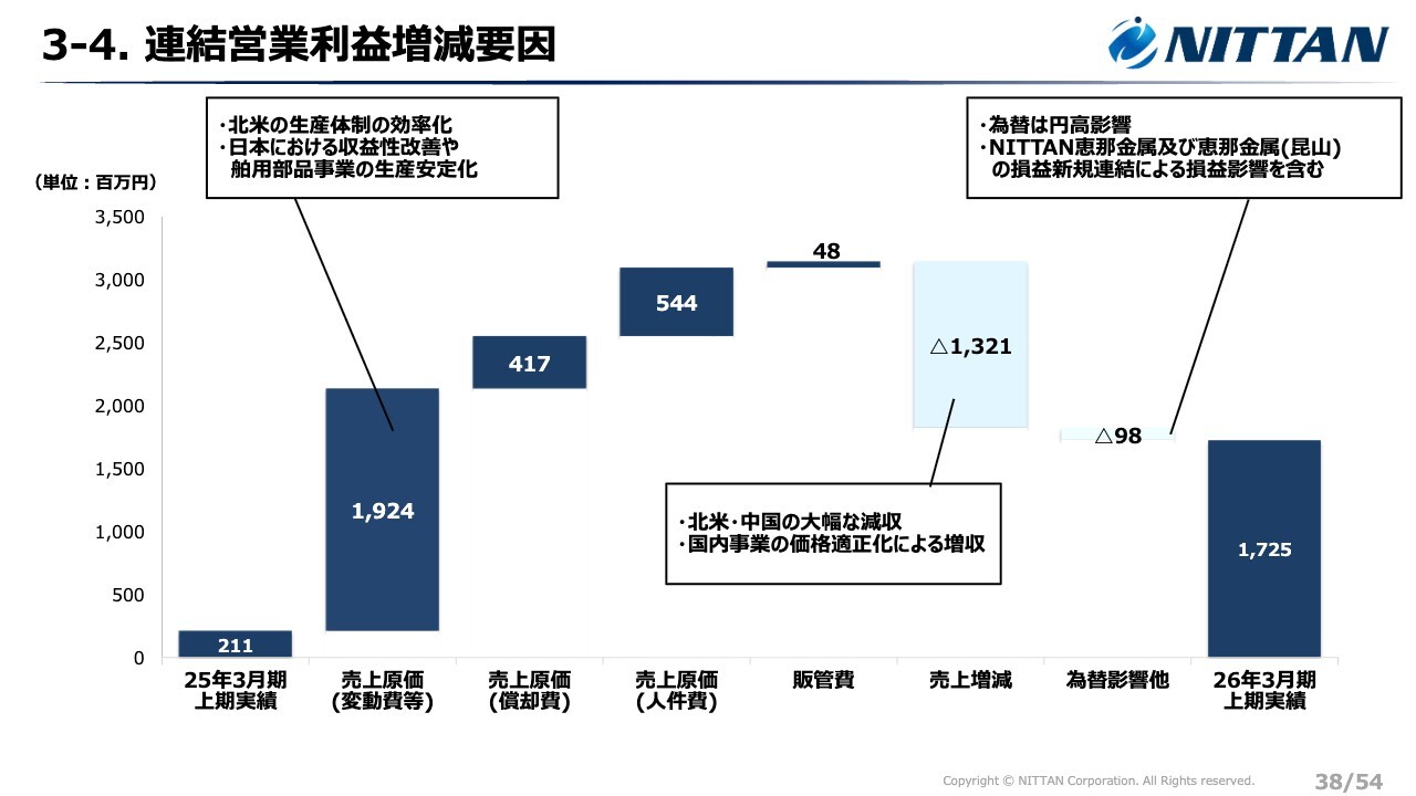 主な要因として、為替影響額を除いて分析すると、北米の生産体制の効率化と舶用部品事業の収益性改善による原価抑制が挙げられます。これらが利益増加に寄与しました。また、昨年度に実施したM&Aにより子会社化した2社の損益を当期から連結しています。