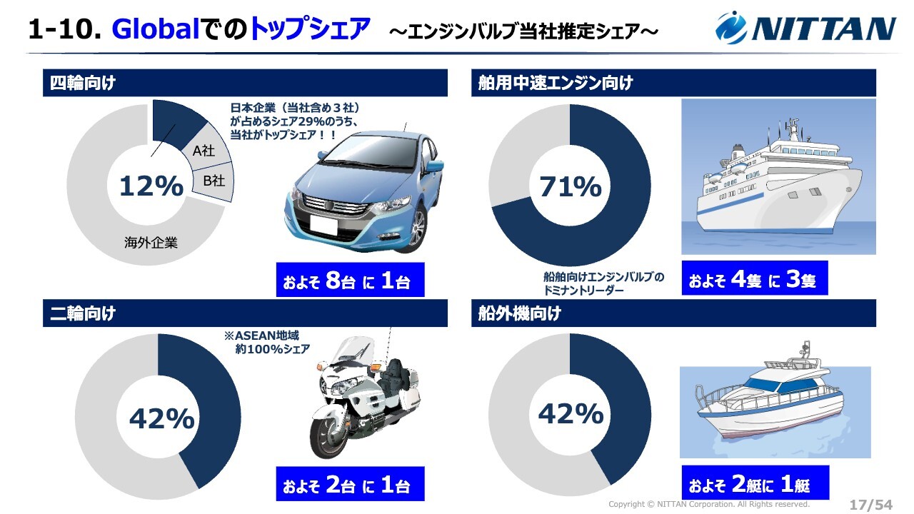当社は日本で初めてエンジンバルブの量産化に成功した企業であり、スライド右下に記載されているように、現在も国内トップシェアを維持しています。