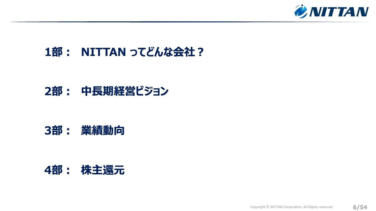 村山誠治氏(以下、村山):執行役員経営企画部担当の村山です。第1部の「NITTANってどんな会社?」についてご説明します。