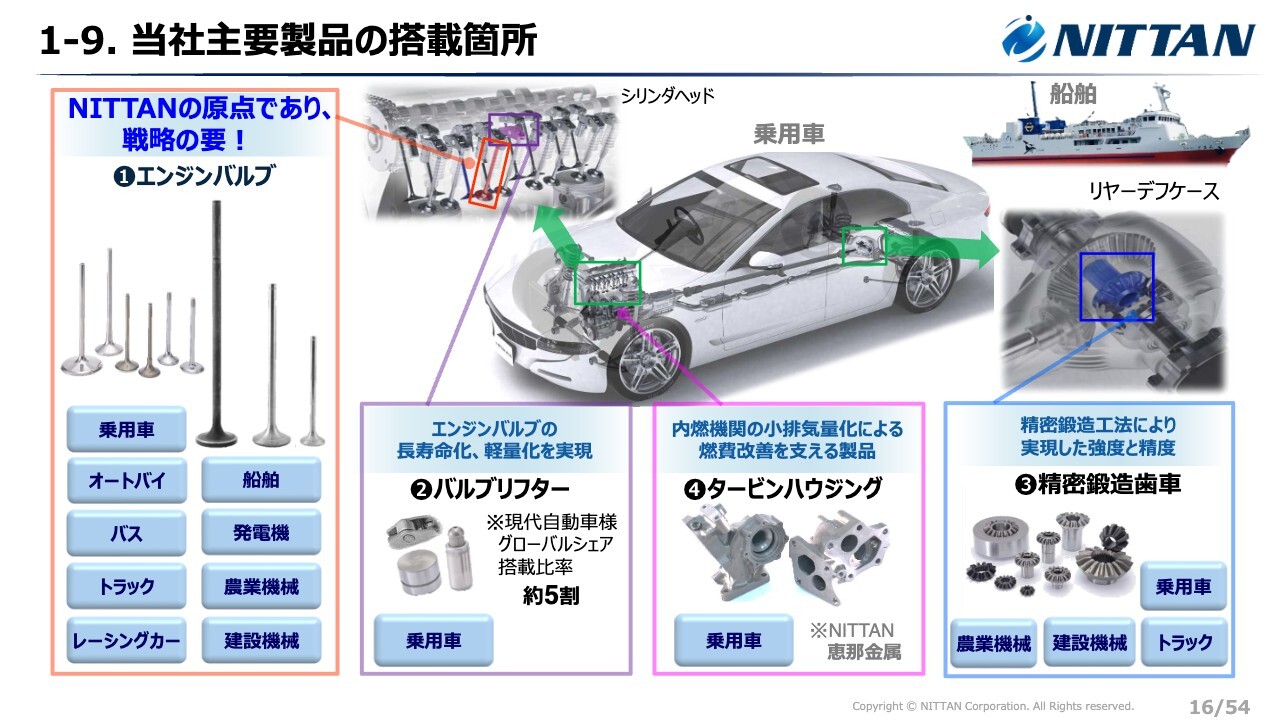 当社は、内燃機関部品の分野でエンジンバルブおよび関連部品、精密鍛造歯車を主力製品として製造・販売している会社です。自動車向けエンジンバルブ事業は広く知られていますが、実は船舶用エンジンバルブ事業でも世界トップシェアを築いています。