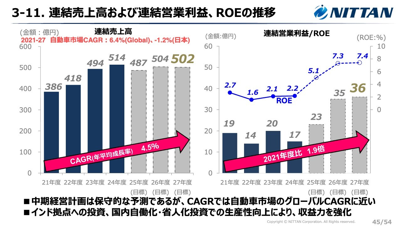 連結売上高については、自動車関連設備への投資の増加や成長が著しいインド市場における受注拡大といった明るい兆しが見られる一方で、中国経済の停滞や急速な円安による資源エネルギーおよび原材料価格の高騰といった要因から、厳しい受注環境が続くと予想されます。このため、2026年度以降も保守的な計画を立てています。それでも、自動車市場のグローバル平均成長率に近い成長を期待しています。