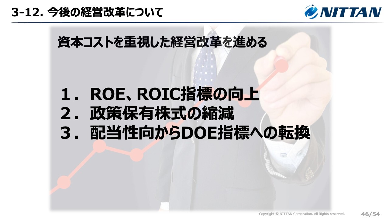 今後の経営改革について、ROEやROICの改善、政策保有株式の縮減、配当性向からDOEへの転換を掲げていますが、今後の事業環境や業績見通しを踏まえ、慎重に検討していきます。これらに関して開示すべき内容があれば、決定次第、速やかにご案内します。