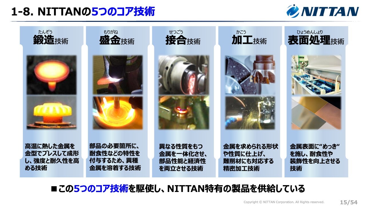 さらに、NITTAN恵那金属の連結化により、新たに「表面処理技術」が第5のコア技術として加わりました。これにより、今まで以上に強みを発揮できると判断しています。