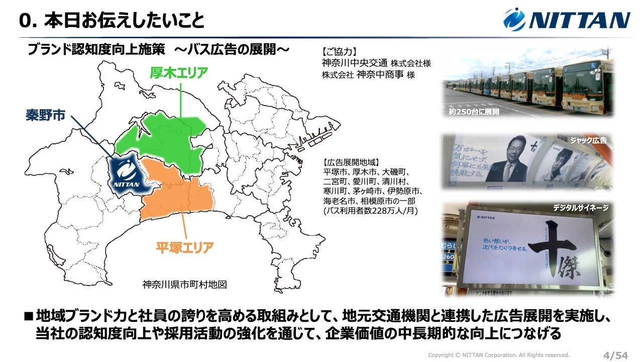 その第1弾として、月間約228万人が利用する平塚・厚木エリアを走る神奈川中央交通のバス250台に広告を展開しました。広告では、私自身とともに、「NITTAN十傑」と題し、社員10名の熱い思いを紹介し、地域のみなさまに当社をより身近に感じていただくことが狙いです。