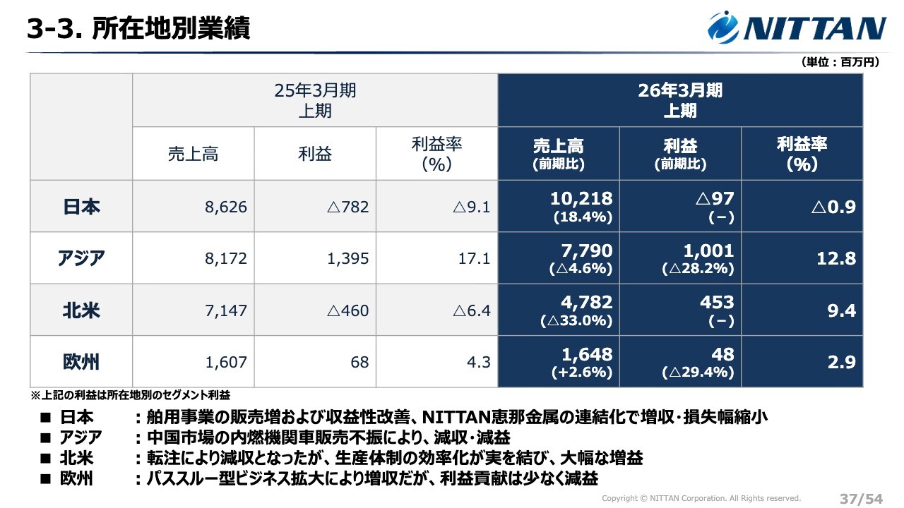 所在地別の業績についてご説明します。国内市場はNITTAN恵那金属の連結化により増収となりました。アジア市場では、内燃機関車の販売不振の影響を受け、厳しい状態が続いています。