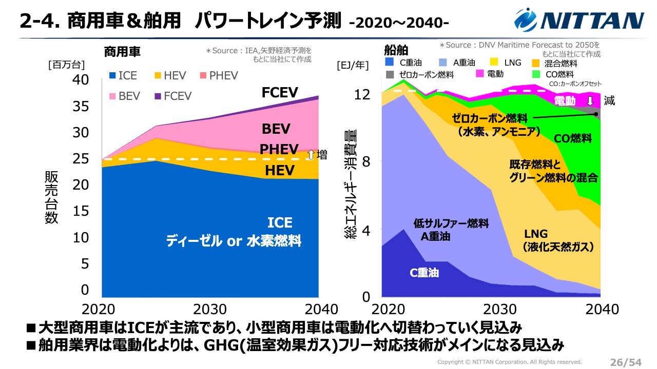 スライド右側のグラフは、船舶向けパワートレインの長期予測です。脱炭素化の流れを受け、電動化よりも温室効果ガスフリーの対応技術が進むと予測されており、特に水素・アンモニアエンジンの開発が急速に進んでいます。