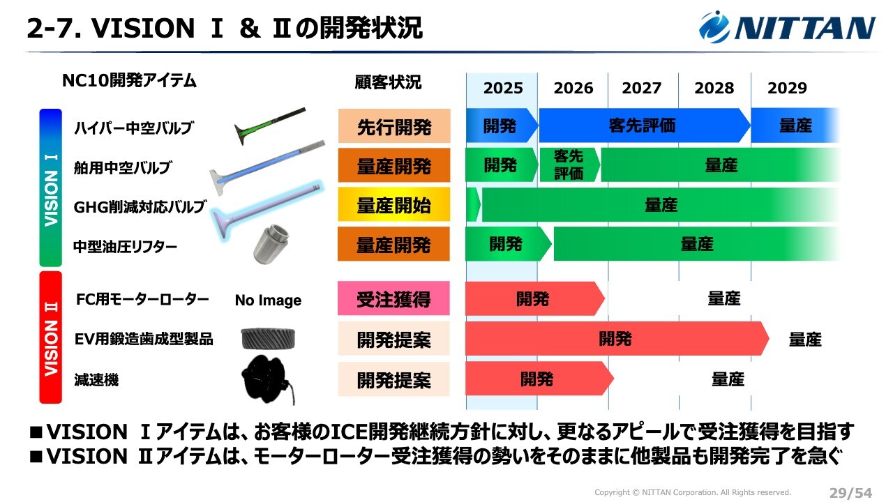 そして、VISION Ⅱでは減速機やFCEV用モーターローター、EV向けヘリカルギアなどの開発を進めています。その詳細な進捗状況については、次ページからご説明します。
