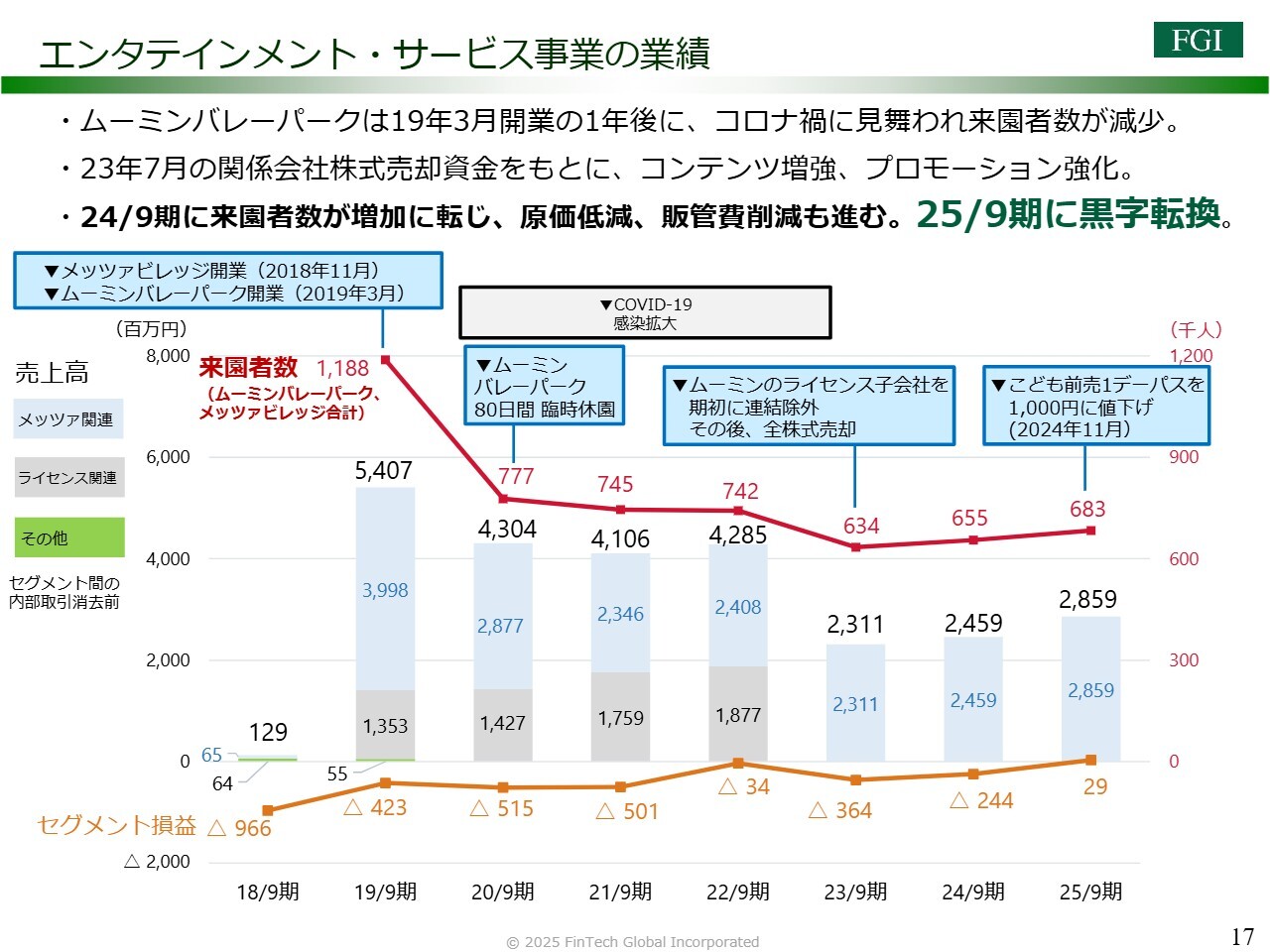 エンタテインメント・サービス事業について、もう少し詳しくお話しします。少し前後してわかりにくかったかもしれませんが、「メッツァ」という名前で「ムーミンバレーパーク」を運営しています。「メッツァ」の中には、「ムーミンバレーパーク」と「メッツァビレッジ」という、まさに入場無料で誰でも入ることができる場所があります。