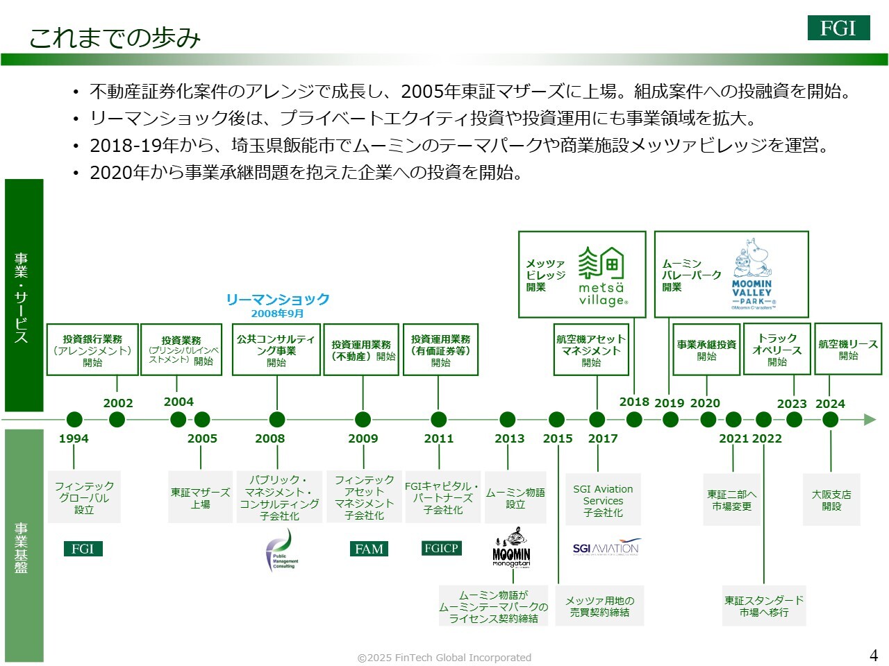 当社は約30年前、1994年に設立され、当初は投資銀行業務(アレンジメント)を柱としてスタートしました。2005年には上場を果たし、そこで得た資金を活用して自己投資が可能となりました。その後、2008年までは順調に発展し、2本柱の事業でうまく成果を上げてきました。
