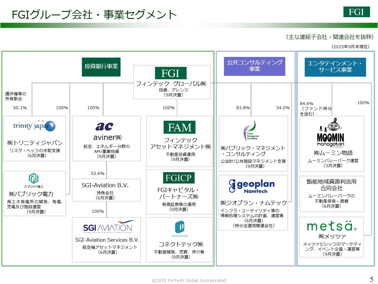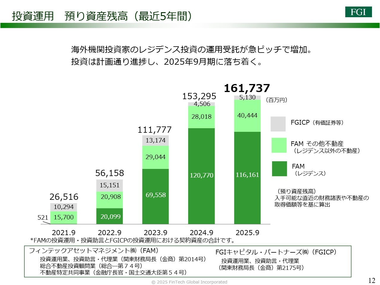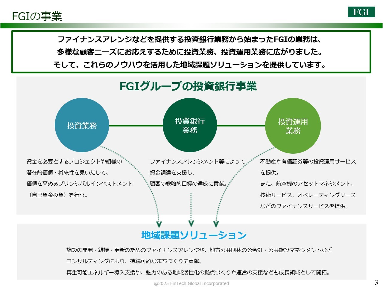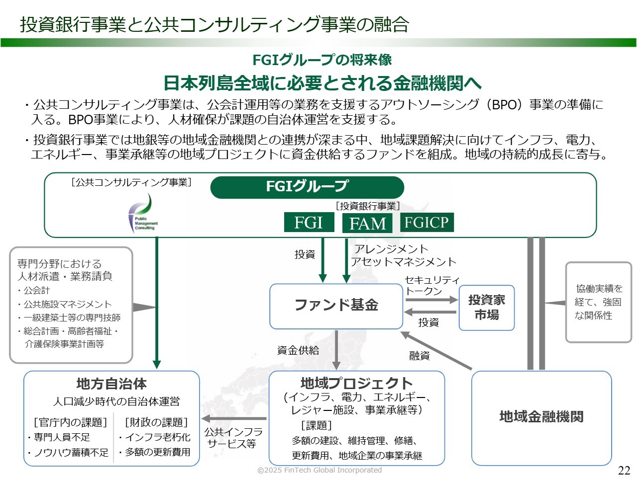 こちらについては、先ほどもお話ししたように、地銀各社が当社と取引する理由の1つがライセンスの問題です。FAM(フィンテック アセットマネジメント)は、不動産の投資運用業務のライセンスを持つ会社で、FGICP(FGIキャピタル・パートナーズ)は、有価証券等の運用ライセンスを保有している会社です。