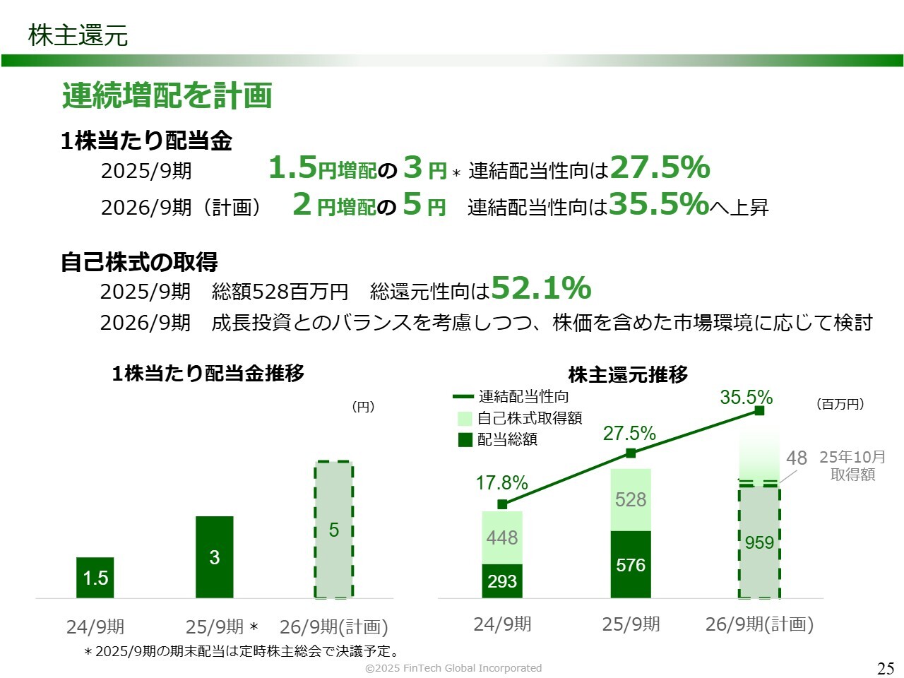 そのため、1株当たりの配当金については、2025年9月期の3円から2026年9月期は5円に増額することを予定しています。