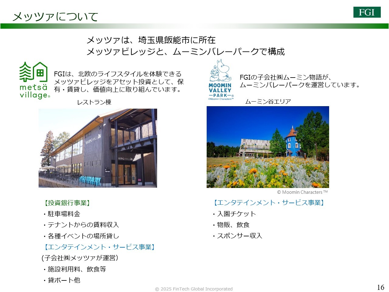 主に「ムーミンバレーパーク」は、地域のみんなで作ったムーミン物語という会社が運営主体となっており、「メッツァビレッジ」については、当社が大家として事業に参画している構造です。