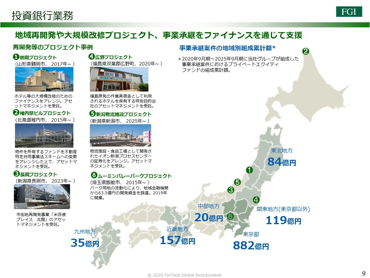 一方で、地方銀行については、投資運用業や金融商品の販売事業などに必要なライセンスを保有していないため、これらの事業を進めることが難しい現状があります。しかし、私たちはこれらのライセンスを有しているため、私たちが参画することで、地方で取り組んでいなかった案件や停滞していた案件が生き残れる可能性を作り出しました。