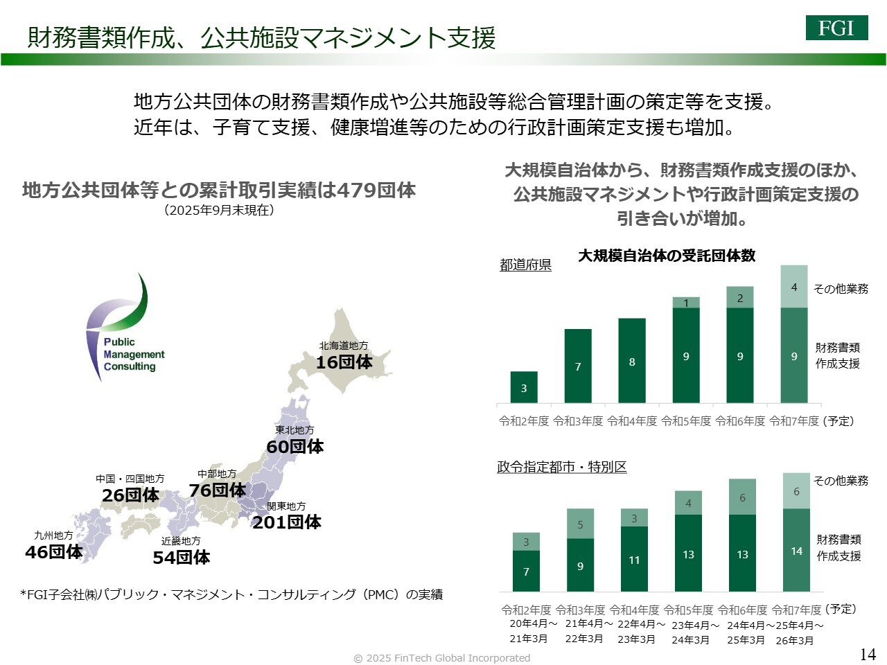 投資銀行事業の右側に示されている公共コンサルティング事業(紫色の部分)は、先ほど述べたようなコンサルティングを自治体向けに提供しています。これら2つの部門を中核とする会社です。