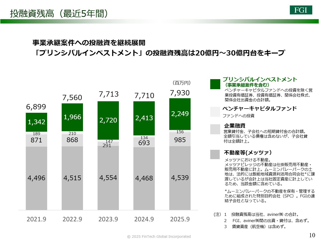 自己投資の勘定です。先ほどお話ししたファンドの部分について、何がどこから入っているかというと、棒グラフの緑色の部分、プリンシパルインベストメントとなります。現状の残高は22億4,900万円です。この金額には、ファンド内で出資金を提供し、最後に責任を果たす立場として必要なお金が含まれています。この自己投資に加え、ファンドを組成し、他社のみなさまとリスクを分担しながら運用しているのが、先ほどお話しした約520億円です。