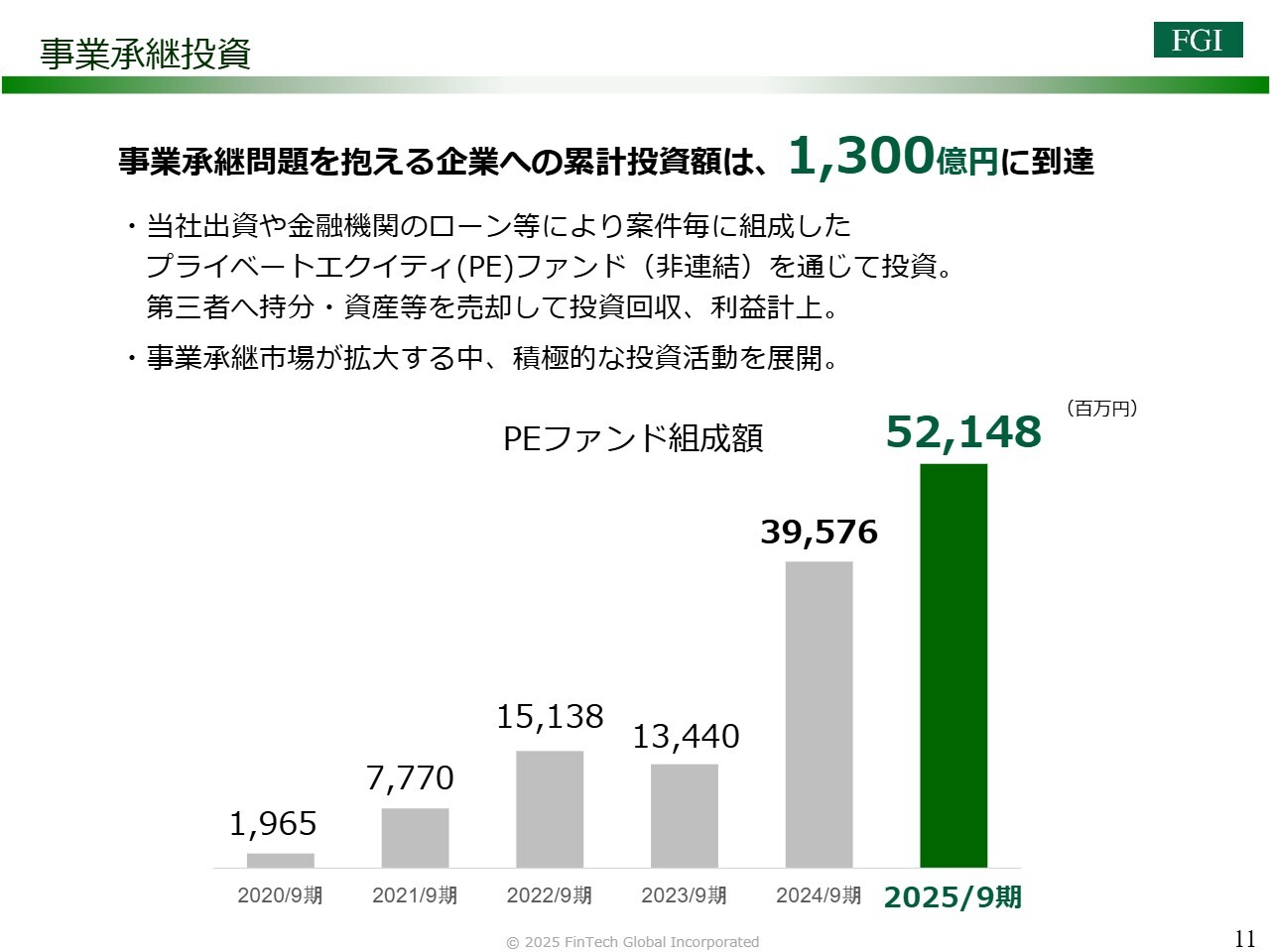 ちなみに前期の第31期(2025年9月期)においては、約520億円のファンドを組成し、事業承継事案の買収を行いました。
