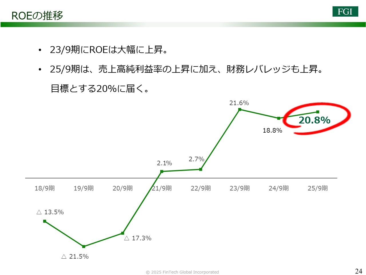 私どもは上場以来20年間、基本的にROE20パーセントを維持することを目標として掲げてきました。大きな波もありましたが、この目標達成のために資本政策を展開してきた会社です。今後も引き続き、ROE20パーセントを目標として維持していきたいと考えています。